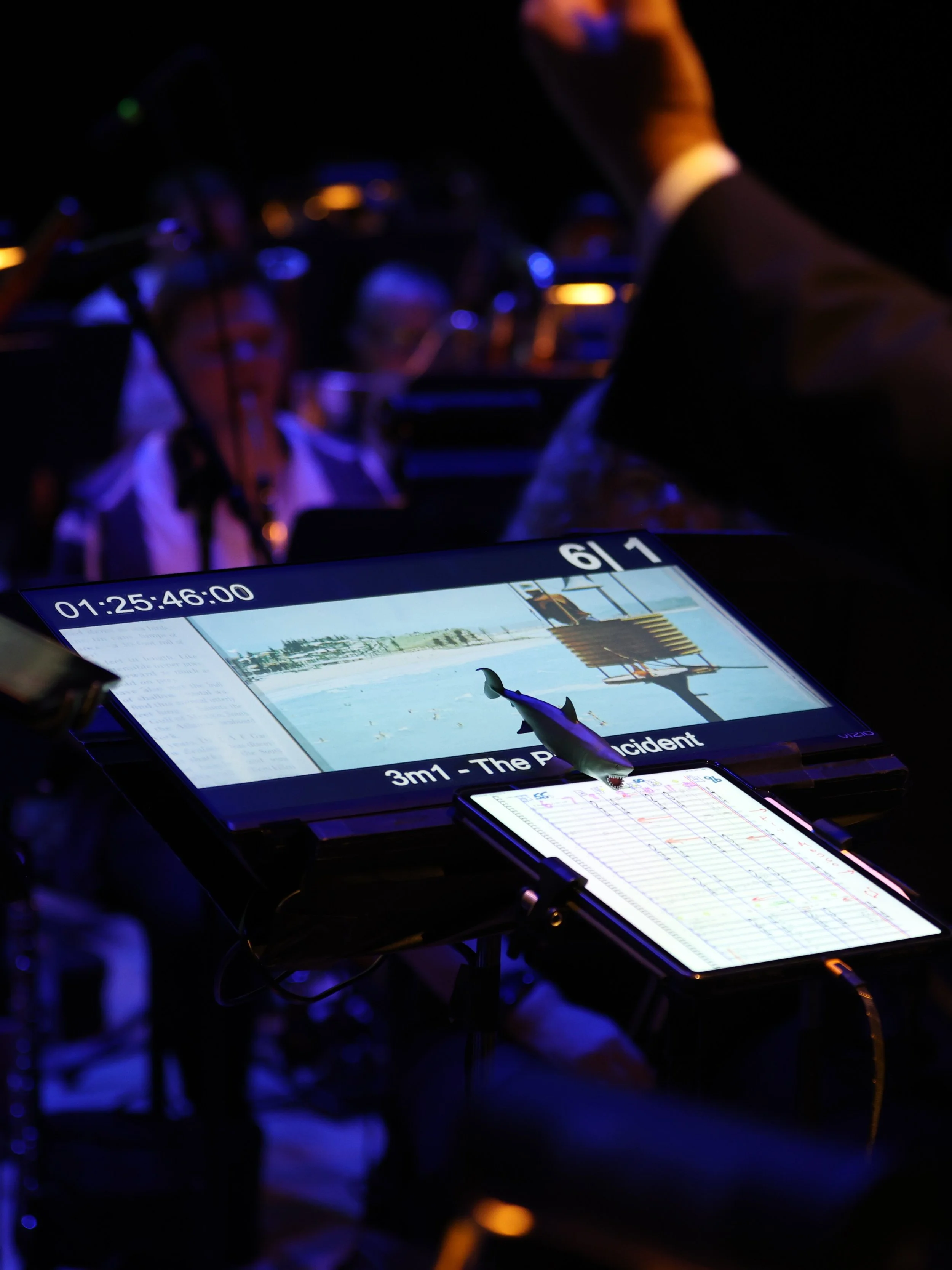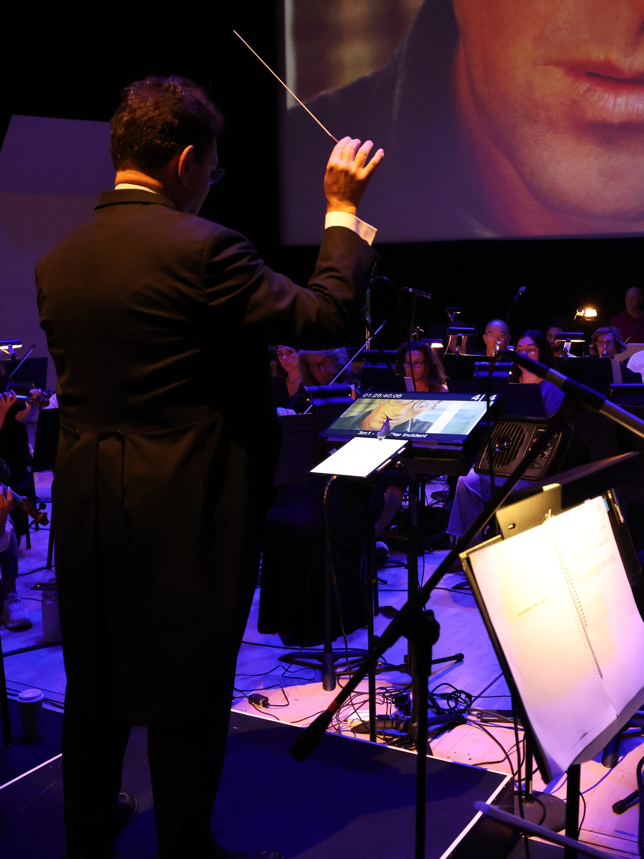 Bernard brings to this work the same interpretive rigor he applies to Mahler or Stravinsky. The score has to live and breathe as music even while tethered to the image. The orchestra has to feel free within the grid. The conductor's role is to hold those two demands in tension — artistic expression and perfect synchronization — and make them feel like one thing rather than two. Every musical decision happens in real time: the pacing of a silence, the weight of an explosion, the breath before a climactic chord, the surge of the music returning after a moment of stillness. These are conducting decisions, not technical ones.
